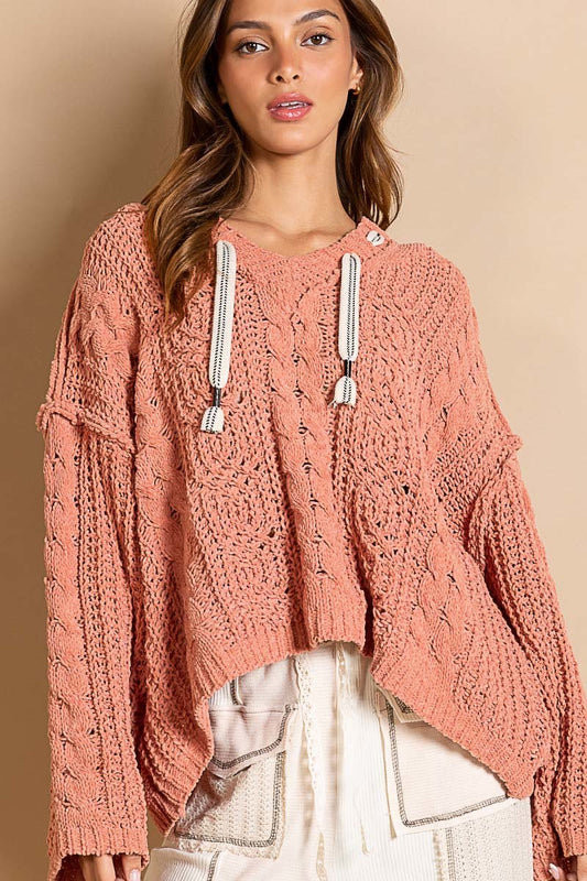 POL V-neck Hooded Cable Knit Sweater
